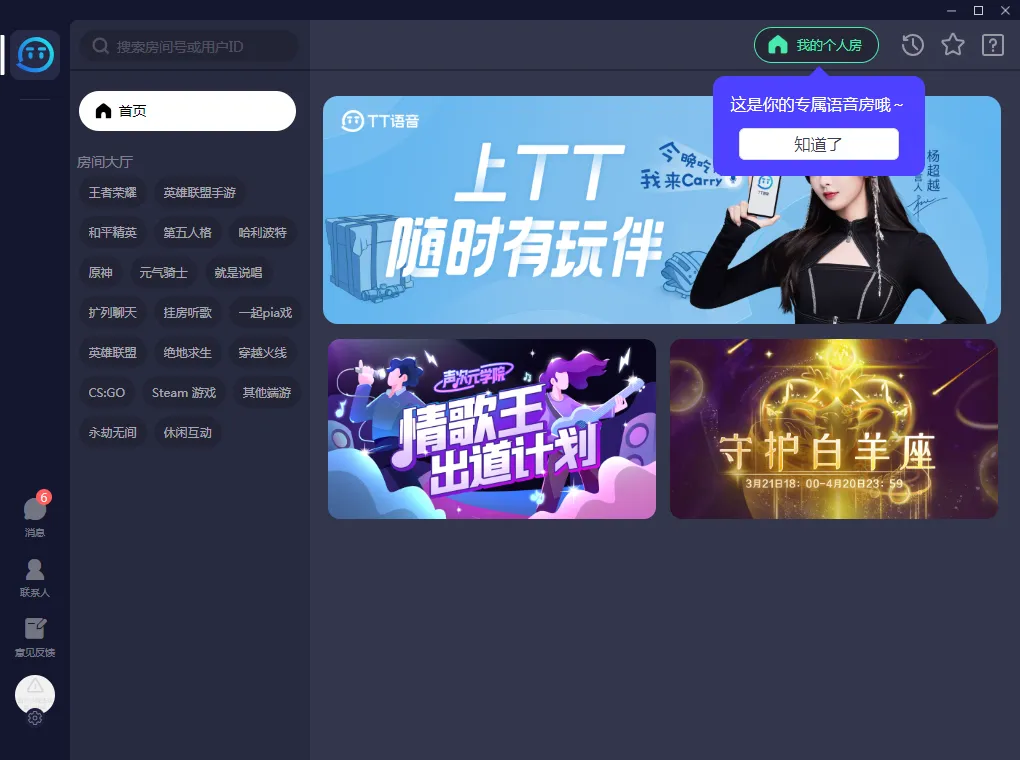 TT语音(6.70.3-18875)是一款热门手游语音开黑软件,支持实时语音、游戏组队、直播交友等功能,LPL/KPL官方指定平台,提供清晰稳定的语音服务及丰富的互动游戏,助你轻松找到游戏玩伴。
